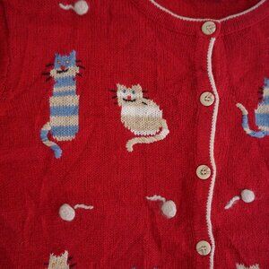 Add a touch of playful vintage charm to your wardrobe with this adorable CJ Banks hand-embroidered cardigan. Done in a bold cherry-red knit, this cozy button-up features whimsical embroidered cats in shades of blue, cream, and white — each full of personality. The fun, nostalgic pattern is finished with soft yarn “balls of string,” cream trim, and matching buttons that make this piece a total conversation starter.