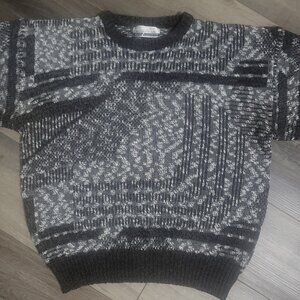 Elevate your cold-weather wardrobe with this vintage CLUB INTERNATIONAL sweater, featuring a bold abstract geometric design in shades of black, white, and gray. With its ribbed trim and intricate knit pattern, this piece blends retro sophistication with modern edge.
