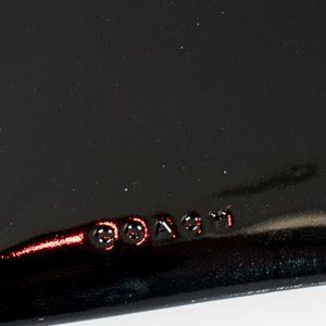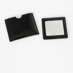 Black shiny patent leather double-sided mirror + case. One side of mirror is regular, the other is magnified. "Coach 1941" is pressed into the leather on one side. Mirror is 3" x 3". Case is just slightly bigger. Slim and perfect for throwing into any bag, purse or pocket for touch-ups on the go.