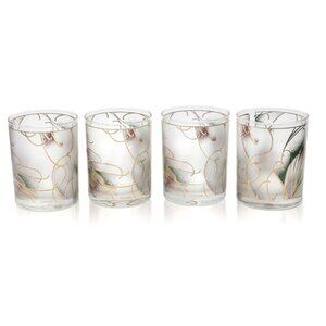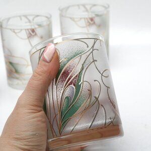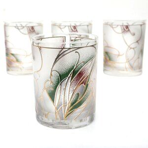 Step back in time with this charming set of vintage 80s CULVER frosted whiskey bar glasses. Each glass is adorned with a delicate gold trim and a captivating floral abstract design, adding a touch of retro flair to your barware collection. These bottom-heavy glasses are not only stylish but also sturdy, making them perfect for both everyday use and special occasions.