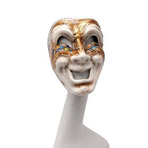 Handcrafted in Venice, Italy, the Vintage Ca'del Sol Venetian Comedy Mask is a stunning piece of art that exudes elegance and mystery. Made with intricate details and high-quality materials, this mask is perfect for a glamorous masquerade ball. The gold and white colour combination adds a touch of sophistication, capturing the essence of Venetian opulence. Inspired by the tradition of Italian comedy, the mask beautifully combines whimsy and beauty, making it a unique accessory that will surely stand out. Get ready to immerse yourself in the magic of Venice and let the happiness of the masquerade ball enchant you.