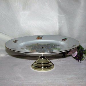Fine porcelain footed cake plate with grapes in center, fruits and nuts on rim. Gold metal pedestal.