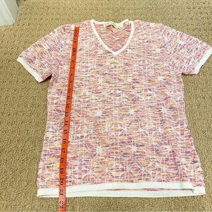 Charming vintage v-neck tee featuring a vibrant rainbow knit in shades of pink, brown, orange, yellow, and white with a Missoni-esque geometric pattern. Finished with crisp white ribbed hems and collar for a clean contrast. A standout retro piece perfect for layering or wearing on its own.