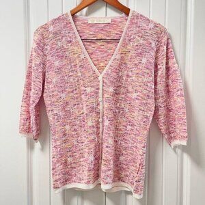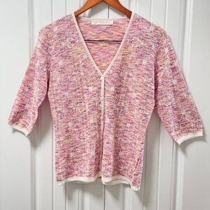 This vintage Camela cardigan features a vibrant geometric knit design in dreamy sunset hues—pinks, peaches, soft yellows, and lavenders. The lightweight, semi-sheer fabric is breathable and stretchy, perfect for layering or wearing on its own. The V-neckline and button-up front give it a timeless and flattering silhouette.