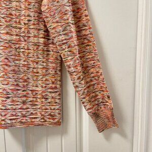 Warm multicolor knit: rust orange, muted pink, mustard, olive, and beige