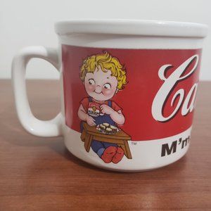If you are a fan of Campbell’s soup and vintage collectibles, you might love this Campbell Soup Mug from 1998. This mug was produced by Houston Harvest Gift Productions LLC, a company that specializes in licensed and promotional products. The mug features the classic Campbell’s logo and slogan “M’m! M’m! Good!” in red and white on a white background. The mug also has a cute illustration of two Campbell kids eating and drinking from their mugs. The mug is made of ceramic. It is microwave-safe and dishwasher-safe, making it convenient and easy to use. This mug is a great way to enjoy your favorite soup or beverage, while also adding a touch of nostalgia and charm to your kitchen. It also makes a wonderful gift for any Campbell’s soup lover or collector. Savor the M’m! M’m! Good! taste of Campbell’s soup with this cozy and collectible mug.