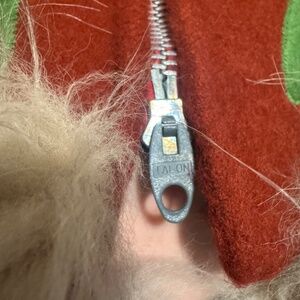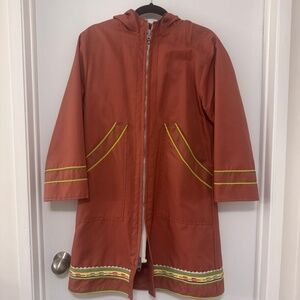 Vintage, handmade/customized, red parka-style jacket with a plaid lining and distinctive appliqués. The patches feature dogs and other folk-art style designs Slight wear, with the bottom of the zipper coming away from the jacket (an easy fix)