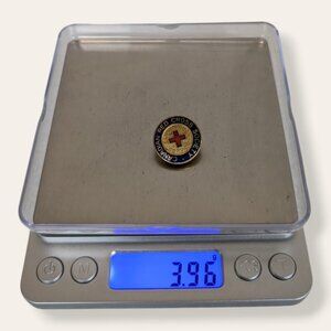 This vintage pin from the Canadian Red Cross is made of a gold/brass tone metal and has a round screw-on backing. The pin is round, and the front has a blue enamel border and a red enamel cross in the center. It says, "CANADIAN RED CROSS SOCIETY, BLOOD DONOR SERVICE". The back of the pin is marked "C. Lamond fils ltee" which seems to be the French version of "C. Lamond & Sons LTD". The pin has wear throughout but is most visible as tone change/darkening on the back of the pin and the round backing.
