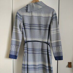 Keywords: Vintage, 1960s, 1970s, patterned, geometric, blue, belted, long sleeve, knee length