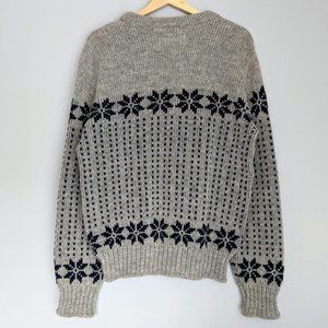 Awesome 1980s vintage Canknit crewneck wool sweater with snowflake motif. Grey with dark navy (almost black) snowflakes and dots. Pure virgin wool. The wool knit is a bit scratchy, so be aware. Made in Vancouver, Canada. Size XL but see measurements. Fits more like a M/L, or as an oversized women's sweater. In good vintage condition, but there is a hole in the left sleeve cuff (see photo), which should be a simple mend for someone who knits.