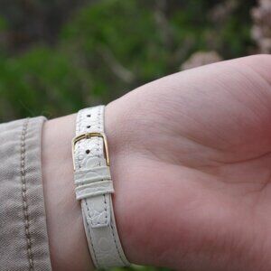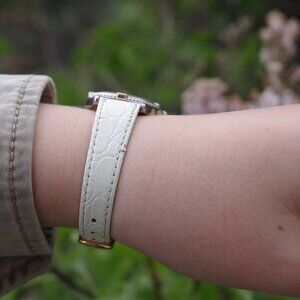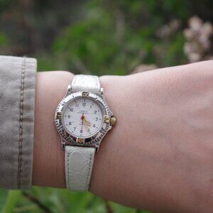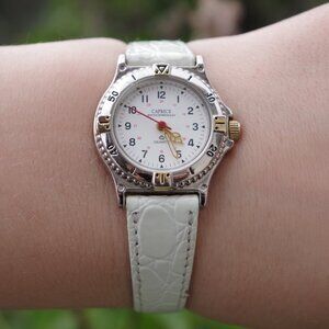 Working Leather white strap Caprice Ladies watch. Japan movement steel back ,in good condition.