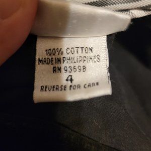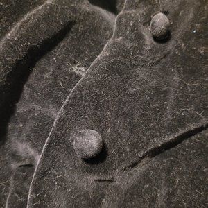 It is 100% cotton but the outside feels and looks like velvet. Black in colour with a striped tie down the front. It also has a long striped sash that can be tied in the front or in the back. Bib style collar.