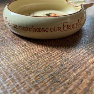 Vintage Carlton Ware ashtray with the inscription "We are given our relations...Thank God we can choose our Friends!" #1755. Made in England trademark stamp. No chips or cracks. Typical wear from age but overall in very good condition..