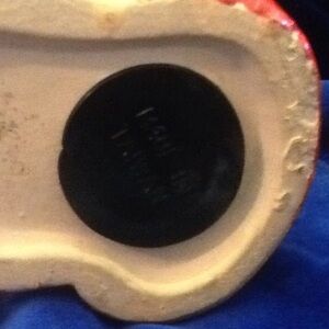 Measuring 16cm by 10cm by 10cm is a fine example of carnival chalkware piggy banks. Most chalkware is usually not coated but this one has a glaze on it so it has worn well through the years. The piggy bank still retains its plug at the botton, most are long gone at this point of age but then again, when I loose a plug i will go to the dollar store and replace it. If you look carefully you can see how the mold joins across the top of her hair and how it was sanded. She is lovely to look at with her bright colours and is a wonderful addition to those who collect ceramics, chalkwares,