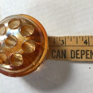 Adorable little floral frog. Made in a marigold carnival glass. Unknown maker.