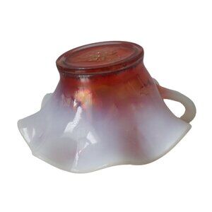 For your consideration is a vintage Carnival Glass Peach Opalescent Bowl w/Handle Holly Berry.