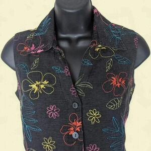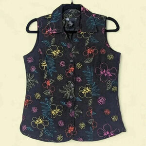 This beautiful, embroidered vintage vest by Carole Little is full of whimsy. With a 100% silk exterior and a button-down front, this vest is a playful way to spice up any outfit.