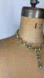 Blue/green/cream varied pearl look beads, silver metal. There is a strand that dangles from the centre. Lobster clasp closure. Has a bit of weight to it.
