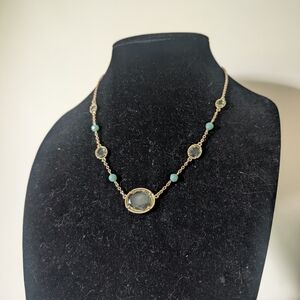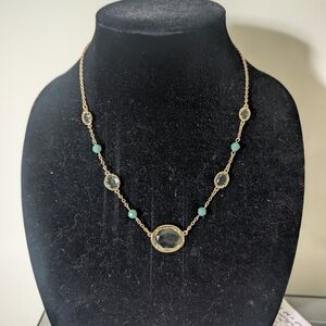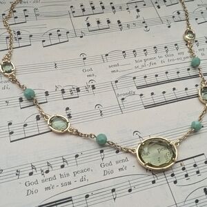 This elegant necklace features a stunning combination of gold and green stones, perfect for adding a touch of sophistication to any outfit.