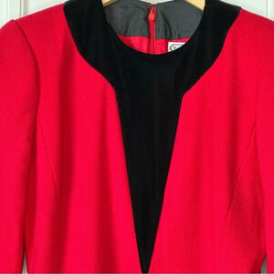 Description: This vintage Carolina Herrera was made by inthe USA and sold at Neiman Marcus ( see tag) and is from the early 1990s. Shoulder pads, Red and Velvet Detailing a stunning beaded tassel. Zipper and hook and eye closure at the back, as well as two zippers on sleeves, are all in working order.