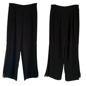 Elegant vintage palazzo trousers featuring dramatic wide legs and sheer chiffon side slits. These high-waisted black pants have a flat front, partial elastic waistband, and zip closure at the back. Made in Canada by Cartise — perfect for evening events, the office, or a stylish boardroom look.