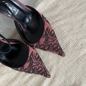 - Salmon pink heels with patterned design