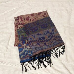 This vintage Cashmink scarf is crafted from 100% acrylic, offering an ultra-soft and warm feel. Featuring an intricate abstract pattern in earthy tones with deep blue and green accents, it adds a sophisticated touch to any outfit. The fringed edges enhance its classic appeal, making it a timeless accessory for cooler seasons.
