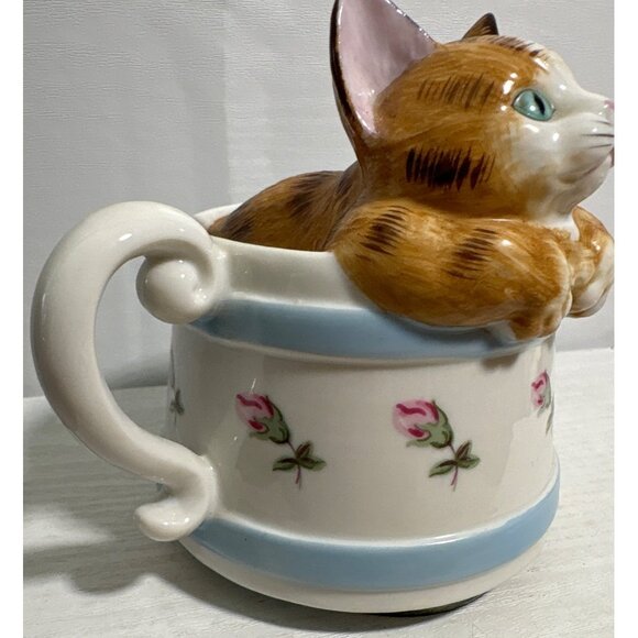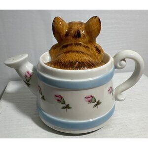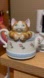 Vintage Cat Themed Music Box Kitten in a Tea Pot Ceramic Floral Pattern Japan