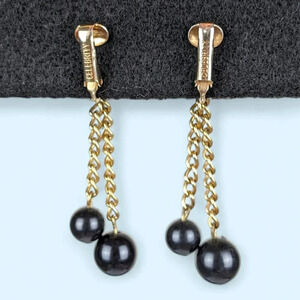 These vintage (double) drop earrings by Celebrity are a great mix of fun and sophisticated. With a gold tone base, these clip-on earrings have a small decorative head with a white rhinestone, feature black plastic balls throughout. Each earring is stamped CELEBRITY on the back of each clip.