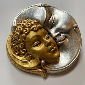 This vintage celestial wall hanging features a stylized sun and moon in a close, peaceful embrace. The sun’s golden face is framed with sculpted curls, while the silver crescent moon gazes serenely beside it. Finished in metallic gold and silver tones, this molded wall plaque captures the dreamy style of late 20th-century home decor.