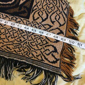 Good preowned condition finely detailed, woven, Afghan throw with 2 and a half layers of thickly woven, preshrunk 100% cotton jacquard weave featuring Triple Morrigan Raven design by Artist, Jen Delyth in threads of orange, black and white. Beautifully made, vintage and original design by this artist. Made in USA and purchased from an online store about 15 or 20 years ago or so. There are some minor pulls, but with some patience they can be maneuvered back into place. I have seen the modern, updated design and it is definitely not quite as nice as these originals.