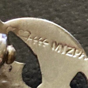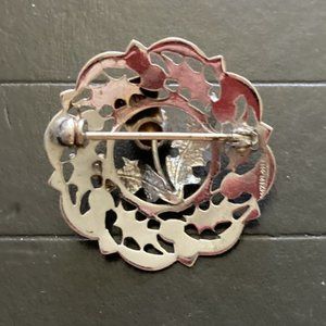 This little brooch, about 1-3/8" in diameter, has lots to tell us. The thisle, here adorned with an amethyst colour glass stone, is a traditional Scottish symbol. The brooch is signed Mizpah on the back, which is a Hebrew term that I understand means something like "may God watch over you". Mizpah jewelry, like sweetheart pieces, was often given to a loved one to suggest the strength of a bond, particularly in the event of a forthcoming separation. The brooch also has the symbol of a double heart with an arrow.