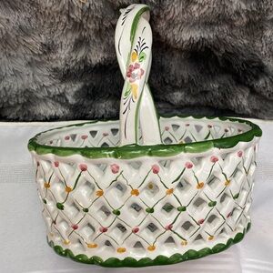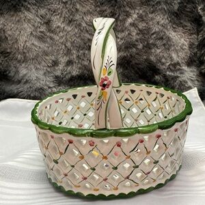 Charming ceramic basket with a hand-painted floral design. Features a green rim and handle.