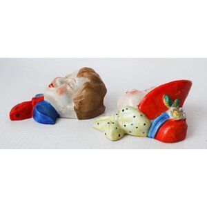 For your consideration is a pair of vintage ceramic wall pocket planters featuring a charming boy and girl faces, hand-painted with intricate details. Manufactured in Japan, they offer both decorative appeal and functionality for floral or greenery displays. A collectible set for those who appreciate retro home décor and unique craftsmanship.