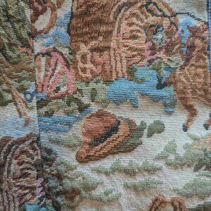 This lovely 1990s chambray vest features woven tapestry panels along it's sides and collar that include pioneer, old west, and equestrian imagery. It has a tasseled yoke in a cream coloured faux-leather material. The vest buttons down the center front from a deep V neckline with three plastic buttons. The back of the vest is a plain blue chambray fabric. This vest looks very smart over slacks, a high-waisted skirt, or a dress. It is perfect for layering with a sweater underneath in chillier months or wearing on its own as a shirt during the warmer ones. No stretch, unlined, no pockets.