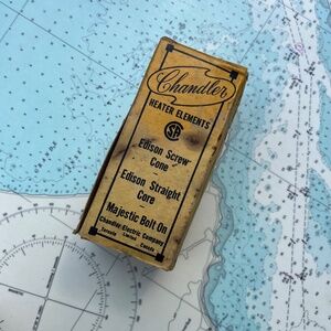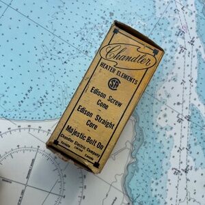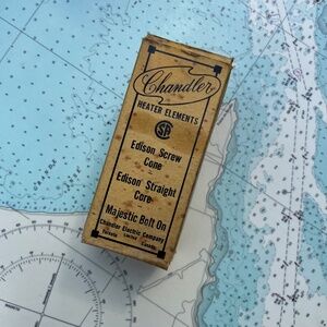 Vintage Chandler heater elements Edison screw cone. See photos for details, would use for display only - unsure if working. Box measures approximately. 5" x 2.25" x 2.25".