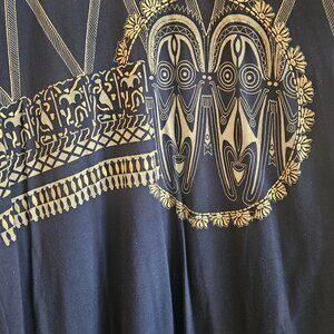 This piece is a vintage 70's viscose tunic, with tribal masks on it. It is from Chapy's in Vancouver (Chapman's) and it is made in Italy. This piece is like new, and has maybe been worn a time or two. It has been in a private collection of a woman who worked in high end retail for 45 years starting in the 50's. It is a size L.The measurements are 31" long, width from armpit to armpit is 24" and the short sleeves are 8" drop shoulders.