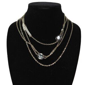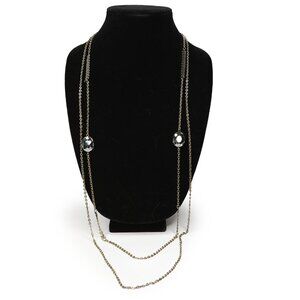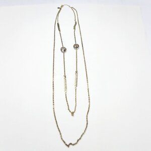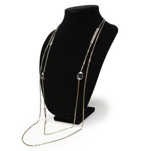 Elevate your look with this elegant Vintage Charming Charlie long double strand necklace, a true statement piece! This pre-loved necklace features a beautiful gold-tone/brass-tone finish with intricate double-strand chains that offer a layered effect. Adorning the strands are unique chevron-shaped links and eye-catching faceted grey/clear glass beads, adding a touch of sparkle and sophisticated detail.
