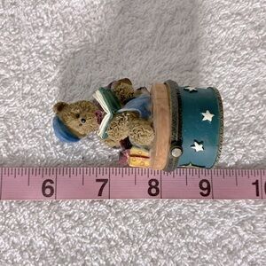 Adorable bear figurine reading a book. Features a blue hat and a teal base with star accents. The base is a tiny trinket box.