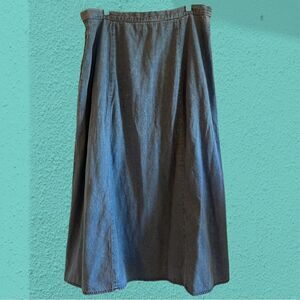 Super cute vintage midi denim skirt. A-line shape, off centre buttons, pockets. Trendy style, perfect for fall. No size tag but has no stretch and fits like a large.