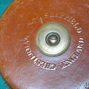 The vintage Chesterman Sheffield England brass leather cloth 50' measuring tape is a classic tool known for its durability and craftsmanship.