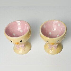 Vintage Chick Egg Cups – Pink Bow Ceramic Set of 2 | Kawaii Easter Decor