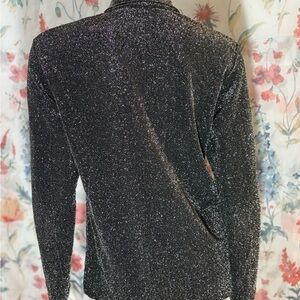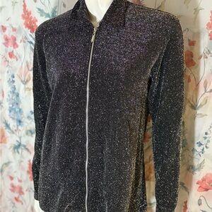 This chic jacket from Chico's features a luxurious black fabric with a subtle shimmer, offering a sophisticated touch to your wardrobe. The jacket boasts a sleek, tailored fit with a full-length zipper and a neat standing collar, making it a versatile piece for any occasion.