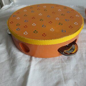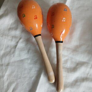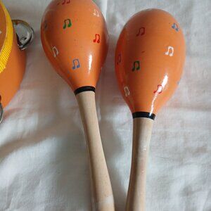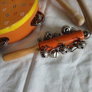 These vintage children's musical instruments all have the same color (orange with music note pattern) and are made of strong and sturdy wood. In very good vintage condition.