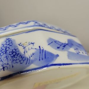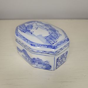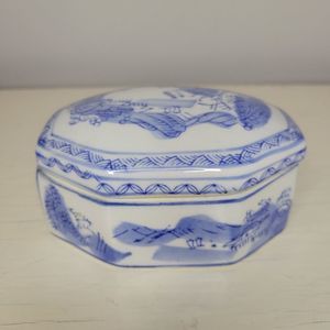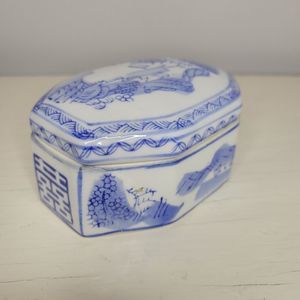 Very beautiful and unique Vintage China Porcelain Lidded box China porcelain with Asian pattern scenes underglaze pattern in blue Handpainted Oval (angular) trinket box jewelry box