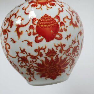 Vintage Chinese Ball Vase with Red Coral Motif Pattern Scroll Vines Koi Fish 10"