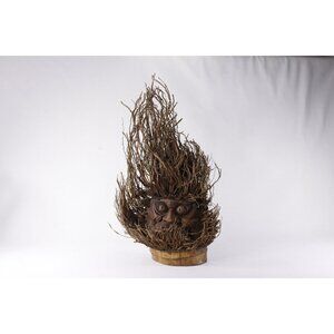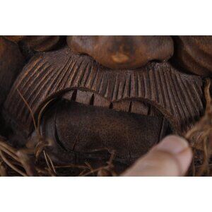 A very lively vintage hand carved lotus root in the likeness of the Bodhidharma. He does however, not appear very Zen, and it could be a representation of a Japanese Daruma (screaming as they are on Fire, they get burned in a ritual every year) or a demon or spirit. It is likely to be Chinese in origin, and it has a flat back so it can hang on the wall. The hair and beard are formed from the natural lotus root and not applied later
