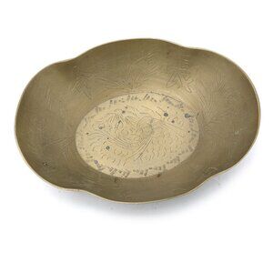 Vintage Chinese Brass Etched Bowl Longevity Prosperity Scalloped Edge Footed