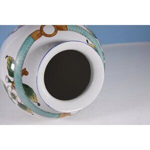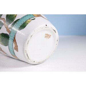 A delightful majolica hand painted vase, made in China ca 1950-1970s. It features a fresh spring design of apples, blossoms, butterflies and ties or ribbons, almost reminiscent of the horse tack patterns which were very popular at the time. In great condition with only some hard water marks on the bottom inside, this would be great in the hallway or kitchen table with a big bunch of flowers! Size: 10.5 inches tall (26.5 cm)