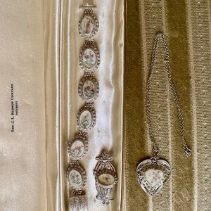 A Chinese filigree set of a pendant, brooch and bracelet. Made from sterling silver and small hand-painted decorative inlays. Beautiful and delicate matching pieces not often found together.